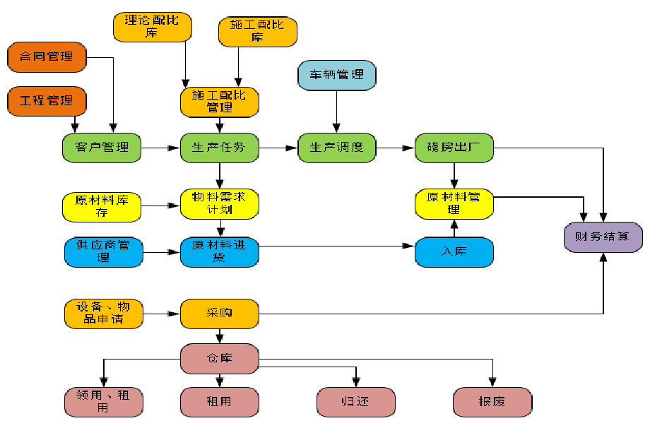 系統(tǒng)從合同的簽訂、生產(chǎn)計劃的定制、生產(chǎn)任務(wù)的排單、實驗室配比的管理、調(diào)度室調(diào)度、攪拌樓生產(chǎn)、原材料消耗的自動生成,到財務(wù)應(yīng)收賬款的生成,整個生產(chǎn)流程信息化,減少人工交流,提高生產(chǎn)效益。