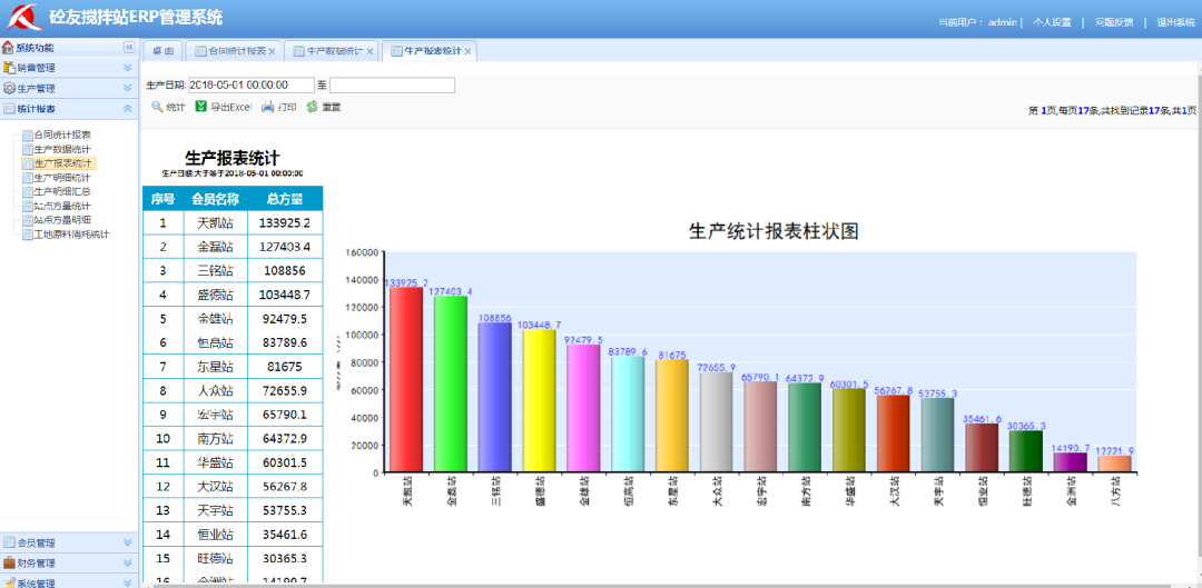 可按時間段統計各個攪拌站的方量及明細,通過柱形圖顯示,生產情況一目了然。
