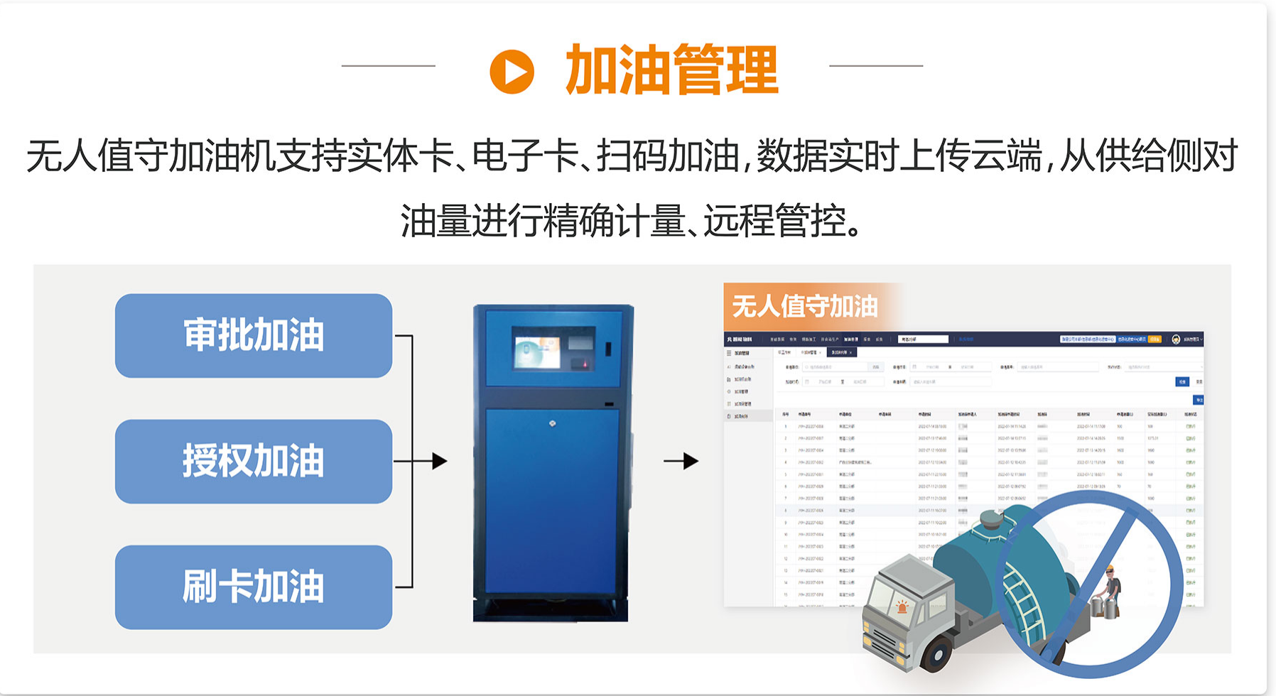 無人值守加油機(jī)支持實(shí)體卡、電子卡、掃碼加油,數(shù)據(jù)實(shí)時(shí)上傳云端,從供給側(cè)對(duì)油量進(jìn)行精確管理